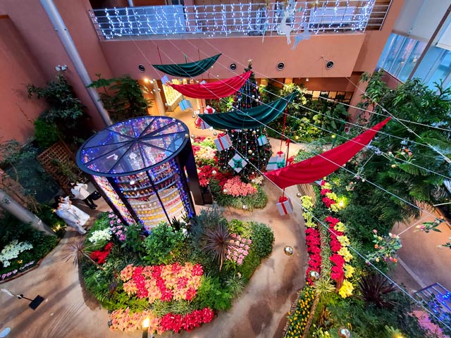 春はチューリップ、初夏はアジサイ、夏はユリ、盛夏はグズマニア、秋はハロウィンの装飾とともにキク、冬はクリスマスツリーとともにイルミネーションの装飾の中でポインセチアやシクラメン、新春はセンリョウ、マンリョウ、シンビジウムなどの縁起物植物、早春はスイセンやラナンキュラスなど一年に8回の展示入れ替えをしています。